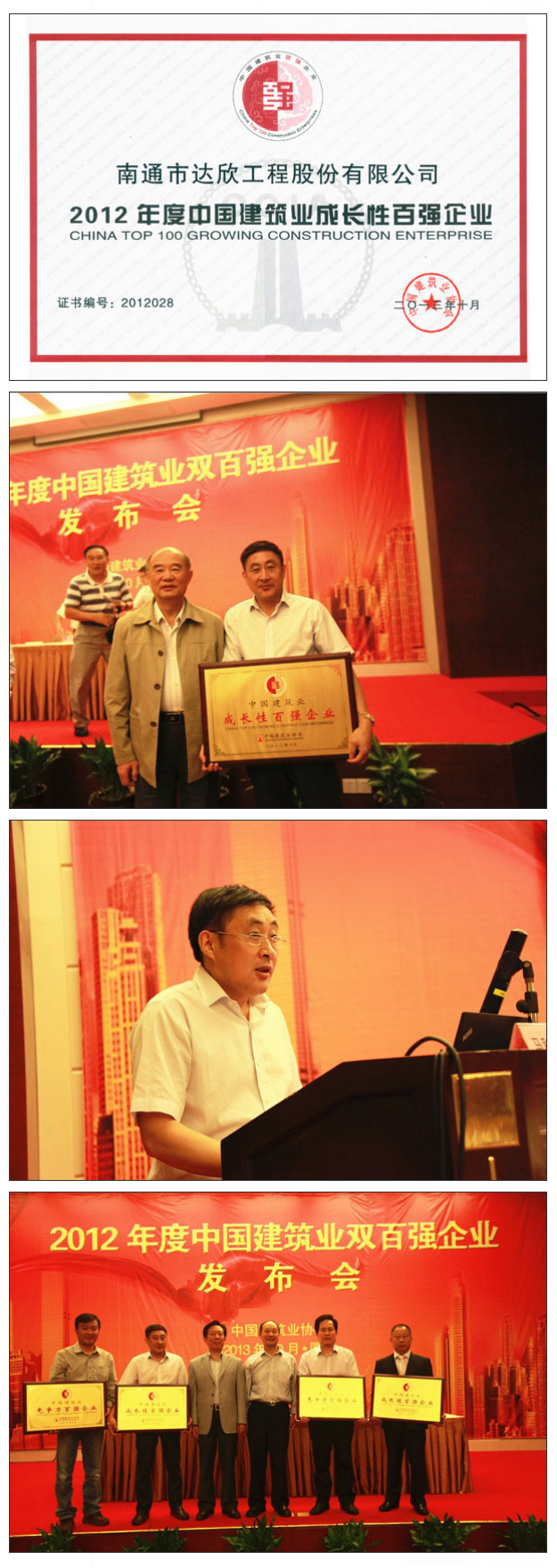 會(huì)議發(fā)布了2012年度中國(guó)建筑業(yè)雙百?gòu)?qiáng)企業(yè),南通市達(dá)欣工程股份有限公司再次入選成長(zhǎng)性百?gòu)?qiáng)企業(yè)(綜合排名位列第28名,比去年排名提高了21位);會(huì)議向2012年度中國(guó)建筑業(yè)雙百?gòu)?qiáng)企業(yè)頒發(fā)牌證,我公司作為獲獎(jiǎng)企業(yè)代表上臺(tái)領(lǐng)取獎(jiǎng)牌;會(huì)議還同時(shí)進(jìn)行了中國(guó)建筑業(yè)雙百?gòu)?qiáng)企業(yè)代表經(jīng)驗(yàn)交流,公司董事長(zhǎng)馬和軍作為江蘇地區(qū)代表、作為成長(zhǎng)性百?gòu)?qiáng)企業(yè)代表在會(huì)上作了“砥礪奮進(jìn),拼搏進(jìn)取,實(shí)現(xiàn)企業(yè)新跨越”的經(jīng)驗(yàn)交流。