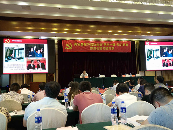 同時(shí),根據(jù)縣委組織部對(duì)“兩學(xué)一做”教育活動(dòng)的工作安排,“聯(lián)合黨委”于5月19日下午舉行“兩學(xué)一做”教育活動(dòng)專(zhuān)題黨課?!奥?lián)合黨委”書(shū)記李忠澤作“兩學(xué)一做”動(dòng)員報(bào)告,海安縣委黨校常務(wù)副校長(zhǎng)徐進(jìn)、副校長(zhǎng)程衛(wèi)國(guó)分別作“學(xué)習(xí)黨章、學(xué)習(xí)系列講話”專(zhuān)題黨課,海安籍在滬流動(dòng)黨員近400人參加活動(dòng)。