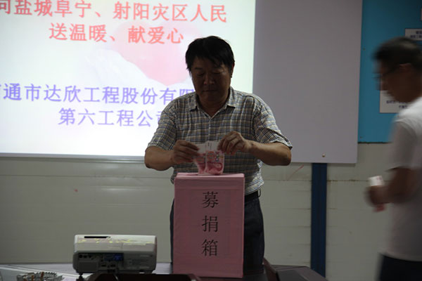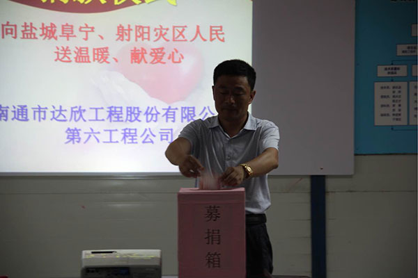 6月23日下午,江蘇省鹽城市阜寧縣、射陽縣部分地區(qū)突發(fā)超強(qiáng)龍卷風(fēng),給當(dāng)?shù)卦斐芍卮笕藛T傷亡和財(cái)產(chǎn)損失。為幫助災(zāi)區(qū)群眾渡過難關(guān),體現(xiàn)中華民族“一方有難,八方支援”的傳統(tǒng)美德,7月1日,在黨的95周年生日到來之際,第六工程公司積極響應(yīng)上級(jí)號(hào)召,動(dòng)員全體干部職工尤其是黨員積極行動(dòng)起來,向?yàn)?zāi)區(qū)進(jìn)行捐款。
