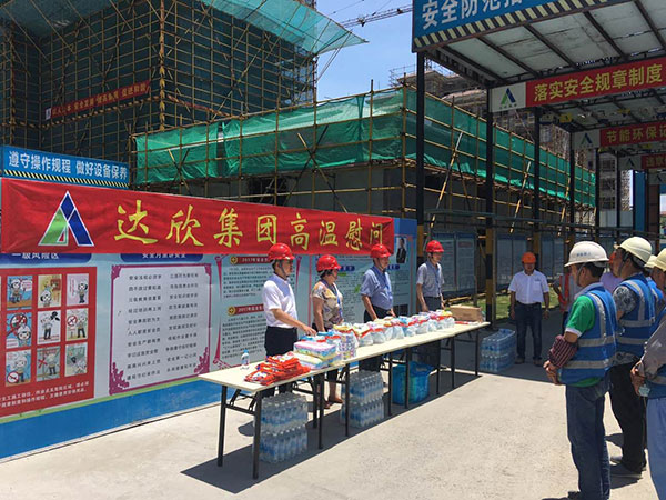 為切實(shí)做好防暑降溫,確保夏季安全生產(chǎn),日前,集團(tuán)公司黨委委員、副總經(jīng)理溫鶴華、常務(wù)副總經(jīng)理王邦國(guó)等領(lǐng)導(dǎo)在第一工程公司經(jīng)理杭小建的陪同下,對(duì)所建的明珠城10號(hào)地塊、旭輝鉑悅犀湖、大豐道誠(chéng)科技大廈、宿遷星月城等項(xiàng)目進(jìn)行現(xiàn)場(chǎng)檢查與高溫慰問(wèn)活動(dòng),為堅(jiān)守在施工一線的職工們送來(lái)夏季的清涼。