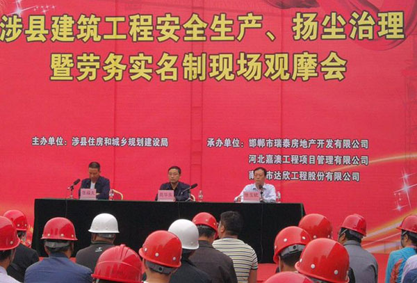 住建局局長(zhǎng)張玉斌對(duì)我公司在御湖天城建筑安全施工、揚(yáng)塵整治暨勞務(wù)實(shí)名制的做法,給予高度肯定。 他表示,我們公司在安全管理、揚(yáng)塵治理及勞務(wù)實(shí)名制的做法為涉縣其他各單位的現(xiàn)場(chǎng)安全管理、揚(yáng)塵治理及有效地維護(hù)農(nóng)民工權(quán)益指明了方向和途徑。