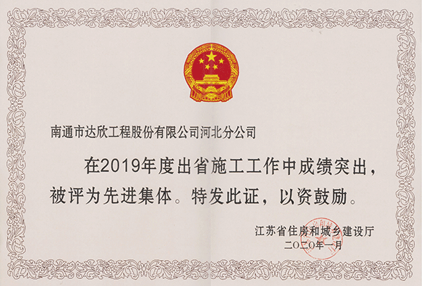 日前,從江蘇省住房和城鄉(xiāng)建設(shè)廳駐天津辦事處傳來捷報(bào),我司第四、六工程公司被評(píng)為“2019年度江蘇出省施工先進(jìn)集體”,第四、六黨支部被評(píng)為“2019年度江蘇進(jìn)津冀施工優(yōu)秀黨組織”,陳仁富、楊靜、徐仁忠同志被評(píng)為“2019年度江蘇進(jìn)津冀施工先進(jìn)企業(yè)經(jīng)理”,謝廣財(cái)同志被評(píng)為“2019年度江蘇進(jìn)津冀施工優(yōu)秀黨務(wù)工作者”,楊靜、傅海榮、陳正進(jìn)同志被評(píng)為“2019年度江蘇進(jìn)津冀施工優(yōu)秀共產(chǎn)黨員”,崔恒俊、謝存宏、曹為華、游慶兵、周小兵同志被評(píng)為“2019年度江蘇進(jìn)津冀施工優(yōu)秀建造師”,徐培華、謝兆波、束長(zhǎng)春、周興穩(wěn)同志被評(píng)為“2019年度江蘇出省建筑施工先進(jìn)個(gè)人”。
