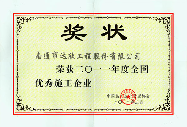 公司榮獲2011年度全國優(yōu)秀施工企業(yè)