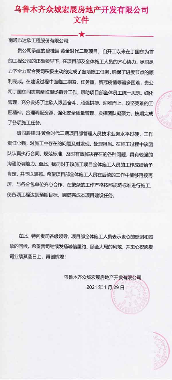 1月29日,集團(tuán)總部收到烏魯木齊眾城宏展房地產(chǎn)開發(fā)有限公司對(duì)第十一工程公司的表揚(yáng)信。詳情如下: