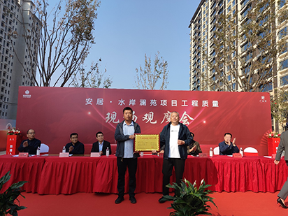 10月19日,第三工程公司承建的安居?水岸瀾苑項(xiàng)目工程質(zhì)量現(xiàn)場(chǎng)觀摩會(huì)暨廣平縣2023年度建設(shè)質(zhì)量樣板工程頒獎(jiǎng)儀式隆重舉行。邯鄲市建筑工程質(zhì)量管理站副站長徐金峰、張少軍科長、廣平縣建筑工程質(zhì)量監(jiān)督站,廣平縣在建工程各施工單、監(jiān)理單位、地產(chǎn)開發(fā)商代表等120余人參加活動(dòng)。安居?水岸瀾苑項(xiàng)目經(jīng)理吉光代表公司接受“2023年度建設(shè)質(zhì)量樣板工程”獎(jiǎng)牌。