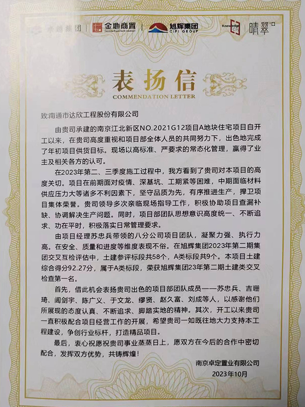 近日,公司收到南京卓定置業(yè)有限公司發(fā)來(lái)的表?yè)P(yáng)信,對(duì)公司南京G12項(xiàng)目管理團(tuán)隊(duì)出色完成年初項(xiàng)目預(yù)期目標(biāo),以及在項(xiàng)目建設(shè)中表現(xiàn)出的專業(yè)、認(rèn)真、負(fù)責(zé)的態(tài)度,不畏困難、迎難而上的精神,高標(biāo)準(zhǔn)、嚴(yán)要求的工作作風(fēng)提出贊揚(yáng)和認(rèn)可。此外,該項(xiàng)目在旭輝集團(tuán)2023年第二期土建類檢查中榮獲第一名的好成績(jī)。
