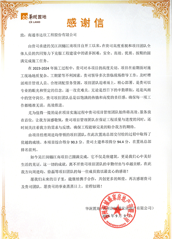 近日,公司收到華潤(rùn)置地發(fā)來(lái)的感謝信,信中對(duì)集團(tuán)第一工程公司承建的吳江潤(rùn)樾江南項(xiàng)目在施工過(guò)程中攻堅(jiān)克難,嚴(yán)把安全生產(chǎn)關(guān),促進(jìn)項(xiàng)目履約,為華潤(rùn)置地高質(zhì)量發(fā)展作出的貢獻(xiàn)表示感謝。