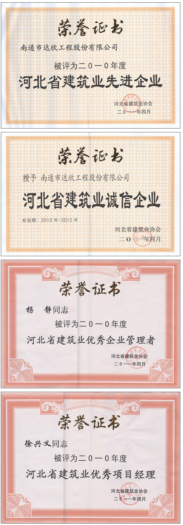 第四工程公司憑著多年的誠信經(jīng)營與良好的企業(yè)聲譽(yù),在本次會(huì)議上榮獲多項(xiàng)殊榮:“2010年度河北省建筑業(yè)先進(jìn)企業(yè)”、“2010-2012年度河北省建筑業(yè)誠信企業(yè)”,楊靜同志榮獲“2010年度河北省建筑企業(yè)優(yōu)秀管理者”,徐興義同志榮獲“2010年度河北省建筑企業(yè)優(yōu)秀項(xiàng)目經(jīng)理”。